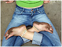 in jeans and barefooted, and shows off her smooth,